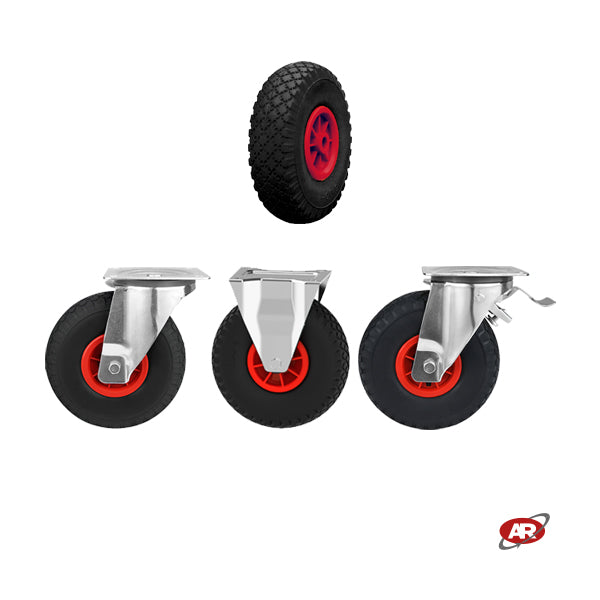 Ruota antiforatura FOAM 260x85 (10"x3.00-4) con nucleo in plastica e anello in poliuretano. Disponibile con supporto in acciaio zincato a piastra fissa, girevole o girevole con freno. Ideale per carrelli, alaggi nautici e trasporto di barche e motori fuoribordo, con portata fino a 80 kg